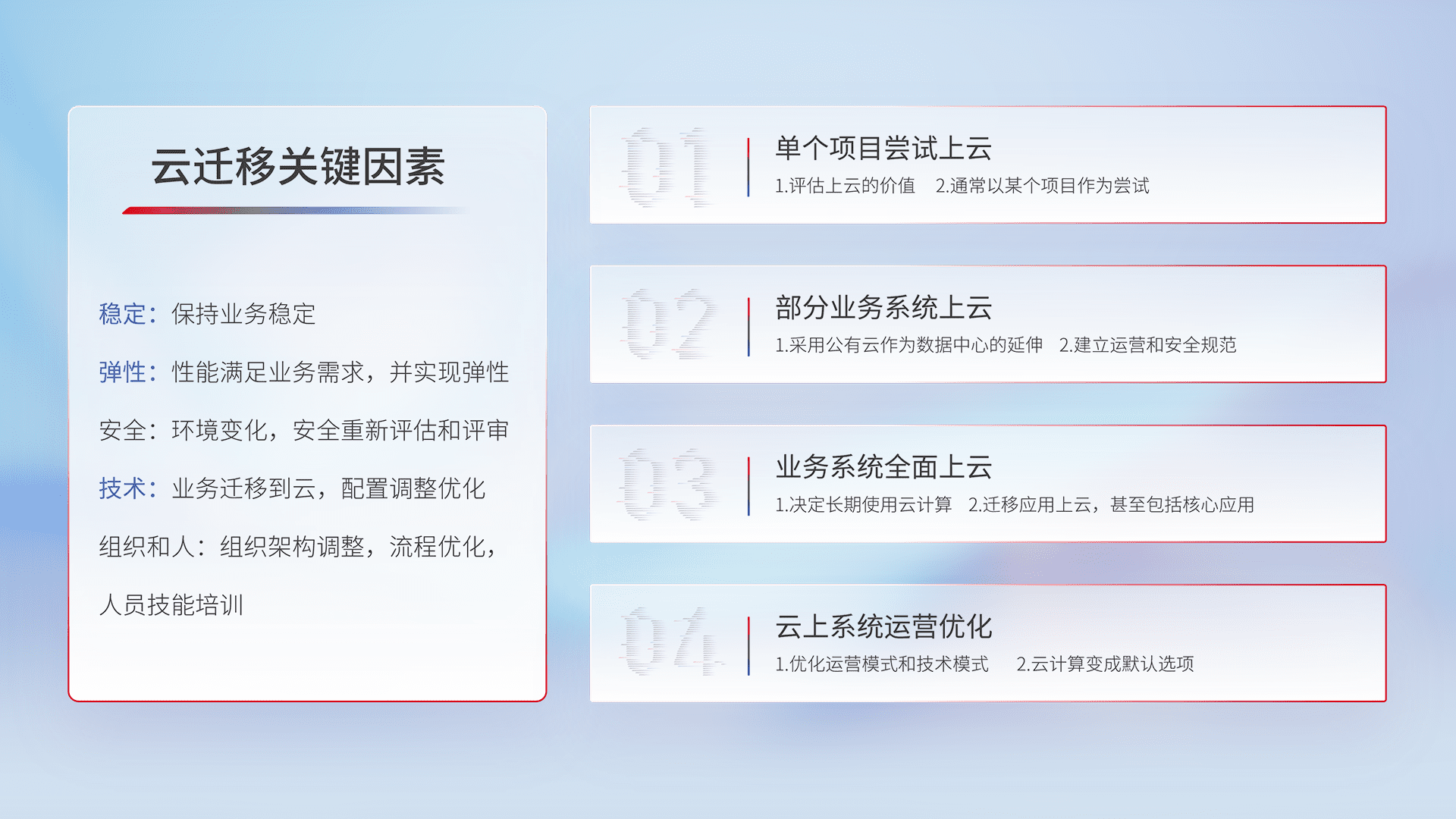 结合实际业务,,,从规划设计、、、云平台选型、、云原生改造、、数据迁移、、、集成交付,,,,迁移全过程为客户识别最佳上云路径,,,做好风险识别管理,,,,设计网络架构、、、、身份权限、、、、安全审计合规、、、、操作审计、、日志审计、、、监控告警策略、、多站点容灾设计等,,,,对云上基础设施进行整体规划,,,提升IT治理水平,,,,以满足弹性、、、、高可用、、、、高性能的需求。。。。